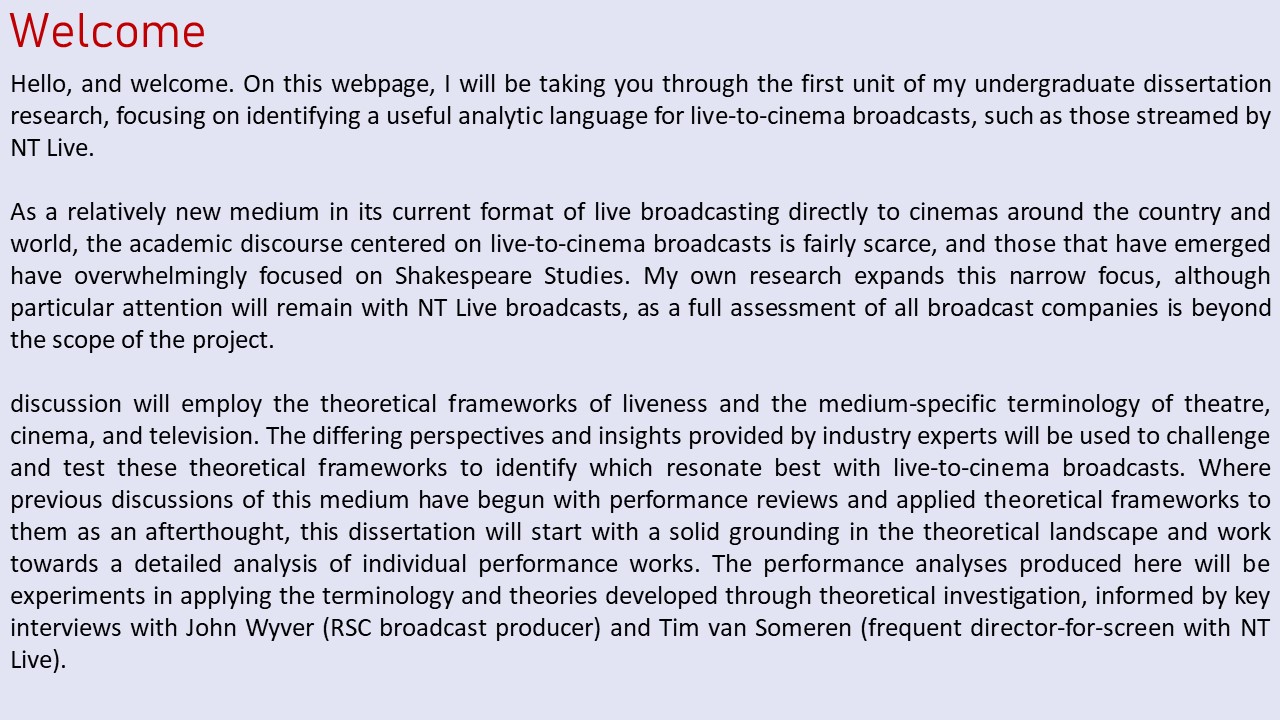 With many unable to welcome live audiences, some theatres have turned to live-streaming productions via internet platforms. These developments seem the next logical step after almost a decade of companies such as NT Live broadcasting productions live to cinemas around the globe. However, as these cinema-streams fall between theatre and film studies, with the exception of some focus from Shakespeare Studies, they have received minimal critical attention. My own research aims to focus on live-to-cinema broadcast theatre through theoretic considerations of liveness, mediatization and my own interviews with key industry experts. I have found that much of the language used to analyse this hybrid form so far has been borrowed from television studies. This project aims to explore and arrive at a critical language that does justice to the complexities of this emerging form. In a time when it is becoming increasingly prevalent, I believe this study to be a vital investigation of the approaches that can and should be taken towards live broadcast theatre.