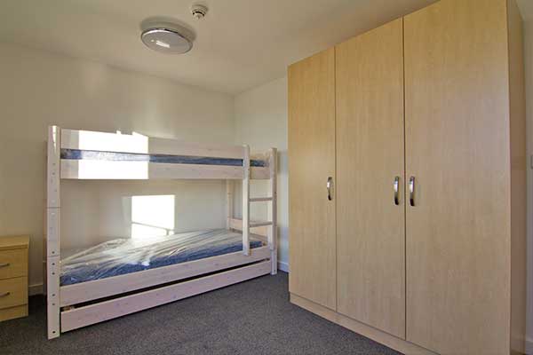 There is one flat on each floor in four-storey blocks, there are no lifts in these buildings. Each has a double bedroom with a 1300mm wide bed, a second bedroom with bunk beds, open plan living/dining/kitchen area and bathroom with a shower over the bath.
