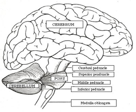 First identified by Herophilus of Chaceldon (355-280 BP), the father of anatomy (who also identified the cerebrum and ventricles in humans), it is commonly referred to as the ‘small brain’, and as the ‘head ganglion’ of the proprioceptive system by Charles Sherrington. The cerebellum is a major structure of the metencephalon (hindbrain), lying above and posterior to the medulla oblongata and the pons, that occupies most of the posterior cranial fossa. Consisting of outer layer of gray matter about 2mm thick (the cerebellar cortex) that overlies a central core of white matter, it is connected to the brain stem by three cerebellar pentacles or attachments (see figure below): the inferior cerebellar penducle (or restiform body) containing afferent fibers, the middle cerebellar penducle (or brachium pontis) that also contains afferent fibers, and the superior cerebellar penducle that carries efferent fibers from the deep cerebellar nuclei to the tegementum (dorsal part of the midbrain).