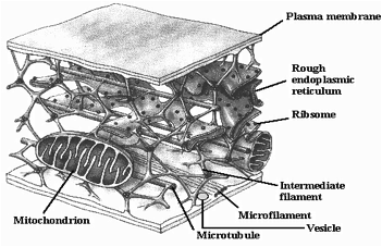 The internal framework (or ‘scaffolding’) of a cell within the cytoplasm, composed largely of actin filaments and microtubules (see figure below). In eukaryotic cells, actin filaments (or microfilaments) are active in muscle contraction, intermediate filaments hold microfilaments and microtubules in place, and microtubules serve as routes for organelles to move along. In general, the cytoskeleton helps to maintain the shape of the cell, enables the intracellular transport of organelles like mitochondria and vesicles (using structures such as flagella and cilia), and plays a key role in cell division and movement.
