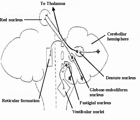 Four nuclei located deep in the cerebellar hemispheres, namely, the dentate nucleus (the largest), the globose emboliform nucleus and fastigial nucleus (which together form the nucleus interpositus), and the globose nucleus (see figure below). All are relay stations for the Purkinje cells from different cerebellar regions. The dentate nucleus receives inputs from the Purkinje cells in the lateral cortex of the cerebellum and has outputs to the ventrolateral thalamus, the cerebellar cortex (which is involved in sensorimotor coordination along with the motor cortex), the reticular formation, the oculomotor nucleus, and the red nucleus through the superior cerebral penduncle. The emboliform and the globose nuclei are the targets of Purkinje cell inputs from the intermediate cortex, and send their outputs to the cerebral cortex and the red nucleus, also via the superior cerebellar peduncle. The fastigial nuclei receive input from the cerebellar cortex covering the vermis, and send efferents to the vestibular nuclei, reticular formation and thalamus through the inferior cerebral penduncle.