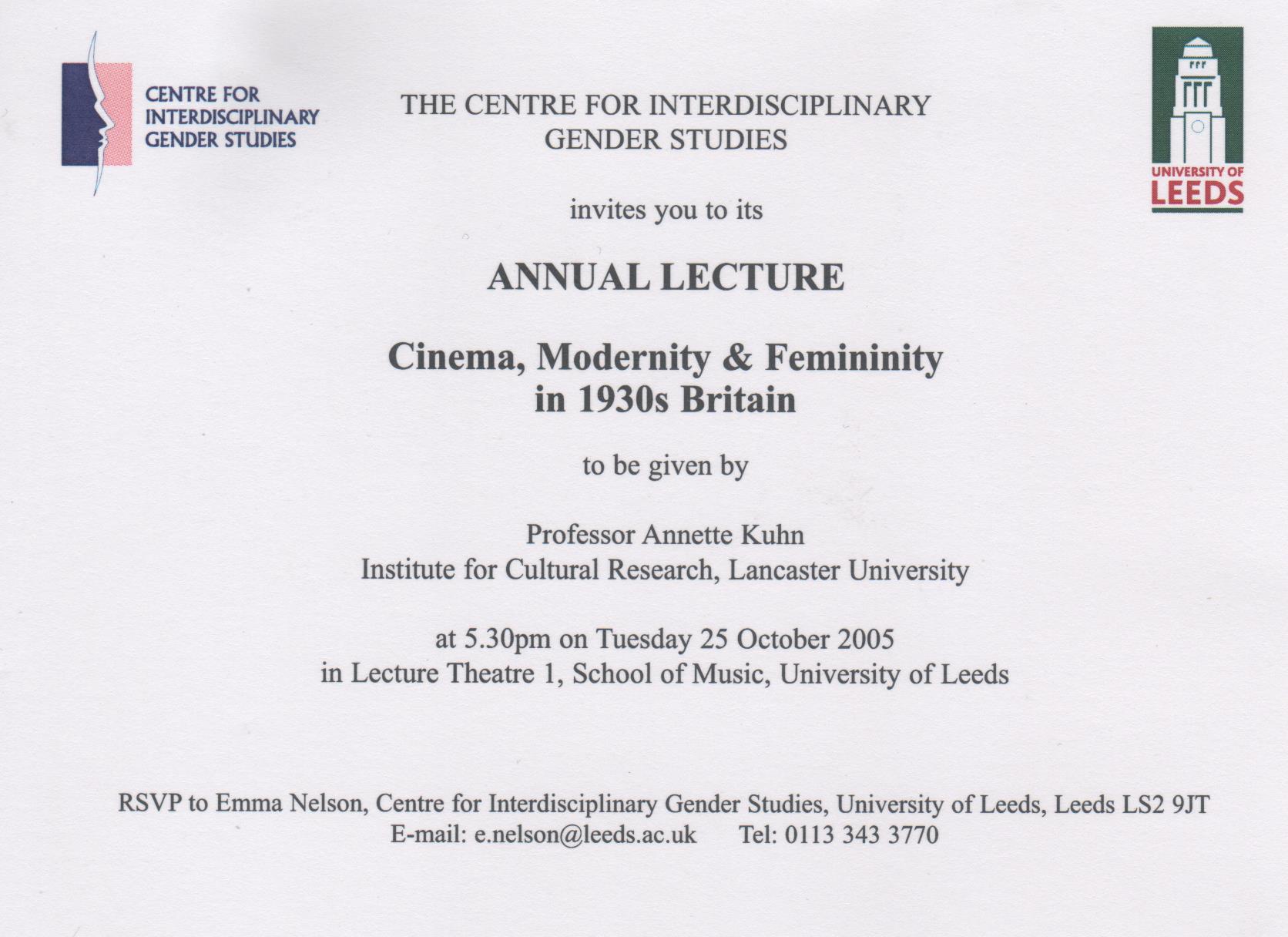 ‘Cinema, modernity and femininity in 1930s Britain’, Centre for Interdisciplinary Gender Studies Annual Lecture, University of Leeds, October.