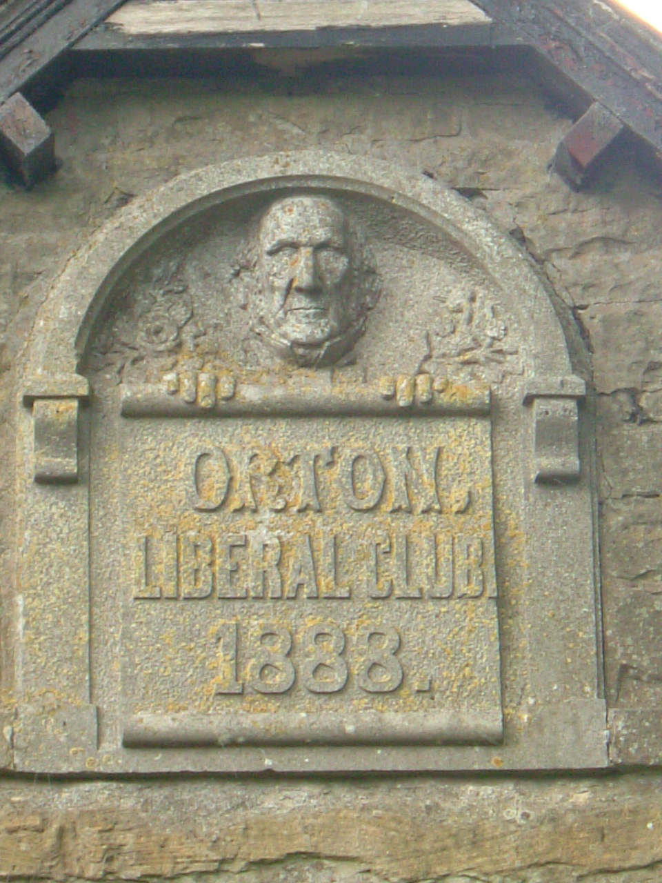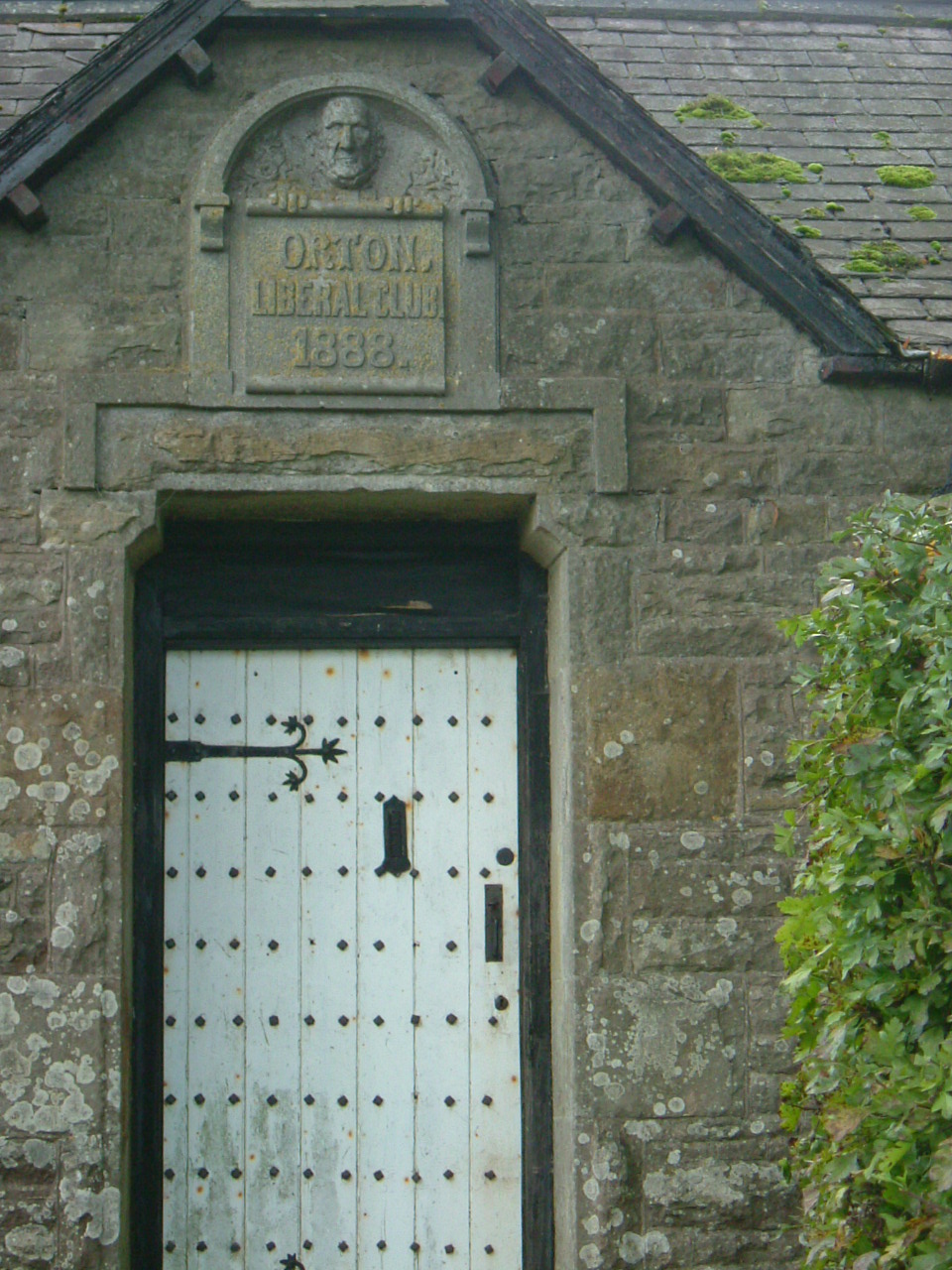 Orton, Westmorland, although only a tiny village close to the Pennines, boasts its own Liberal Club, opened in 1888. The plaque speaks of community pride, but features an individual - Party leader, William Ewart Gladstone - in a head and shoulders view, surrounded by what appear to be wild flowers such as dog roses. He holds the legend which ties the Party leader to a folk community of local people. Thus the plaque roots the individual, who would otherwise be distinguished from his audience by hierarchy, education, social status and geography, within the community and within expressions of both landscape and built environment. |