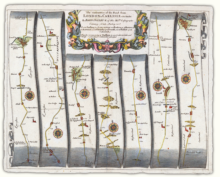 The Old Cumbria Gazetteer by Martin and Jean Norgate, a treasure-mine of information, images of maps, and topographical writings on the Lake District. John Senex, a distinguised geographer, cartographer, and explorer, published a reduced-size (c. 20cm x 15cm), version of Ogilby's maps in his Actual Survey of all the Principal Roads of England and Wales (1719). He incorporates the distances in the cartouche at the top of each map. Ogilby's road maps were 'improved' by John Owen & Emmanuel Bowen (1694–1767), in their Britannia Depicta or Ogilby Improved (1725). They also reduced them to a manageable travelling size: these cropped pages are 137mm wide by 220mm high. Bowen was responsible for engraving the 272 strip maps, and Owen, the antiquarian, the topographical information. They printed the useful information for travellers supplied by Ogilby alongside the maps on the same page, adding further historical notes, coats of arms (to be coloured in), and descriptions of the nobility and gentry associated with the area: for example, the entry below on Skipton (last column of page 123: the town actually appears on the map on the previous page) waxes eloquent about Lady Anne Clifford. It gives a much stronger impression of being intended for tourists, whether practical or armchair. ![]() John Owen and Emmanuel Bowen Britannia Depicta or Ogilby Improved (1725),