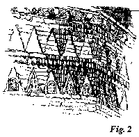 § 26. Such being the construction of the lower band, that of the upper is remarkable only for the curious change in its proportions. The two are separated, as seen in the little woodcut here at the side, by a string-course composed of two layers of red bricks, of which the uppermost projects as a cornice, and is sustained by an intermediate course of irregular brackets, obtained by setting the thick yellow bricks edgeways, in the manner common to this day. But the wall above is carried up perpendicularly from this projection so that the whole upper band is advanced to the thickness of a brick over the lower one. The result of this is, of course, that each side of the apse is four or five inches broader above than below; so that the same number of triangles which filled a whole side of the lower band, leave an inch or two blank at each angle in the upper. This would have looked awkward, if there had been the least appearance of its being an accidental error; so that, in order to draw the eye to it, and show that it is done on purpose, the upper triangles are made about two inches higher than the lower ones, so as to be much more acute in proportion and effect, and actually to look considerably narrower, though of the same width at the base. By this means they are made lighter in effect, and subordinated to the richly decorated series of the lower band, and the two courses, instead of repeating, unite with each other, and become a harmonious whole.
