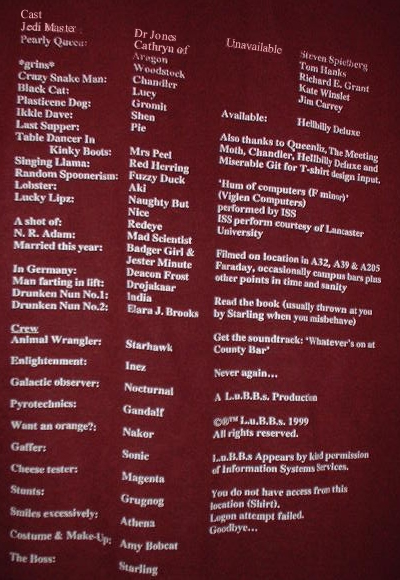 This year the theme was film credits, with the user's name and role in the cast or crew. On the front of each t-shirt was embroidered the user's name and the lubbs oval logo.