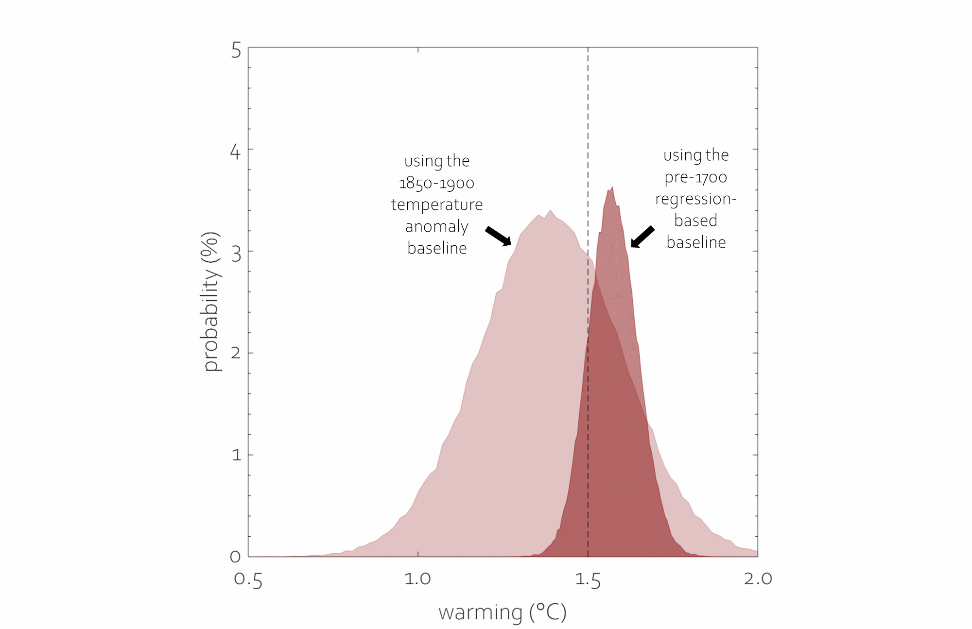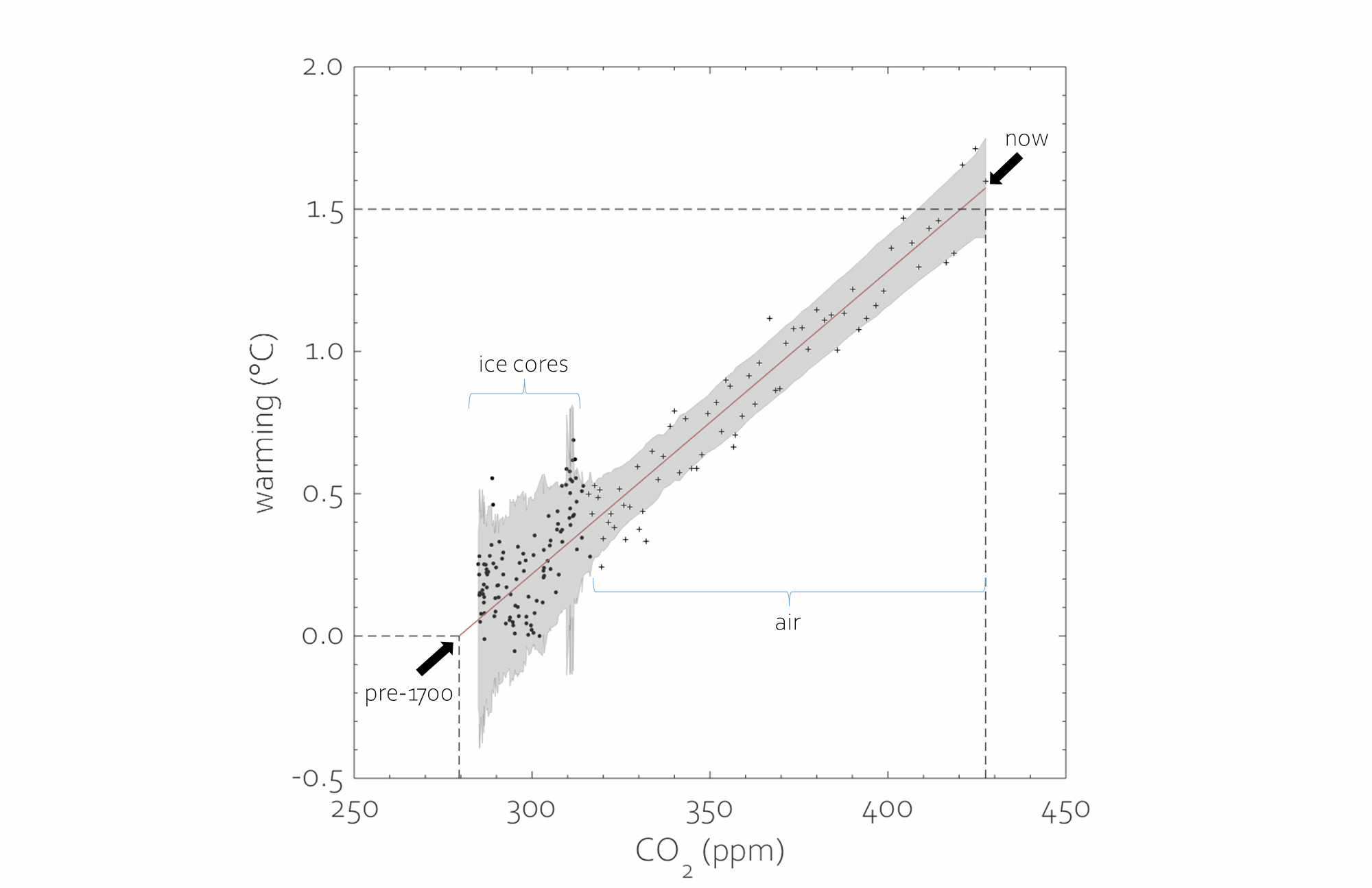 Fig. 1. The relationship between the concentration of CO2 in the atmosphere and increases in global mean temperature. These are annual data from 1850 - 2025 and the data sources and analysis can be found here. Fig.1 summarises a simple analysis which applies linear regression to global CO2 and temperature data. This regression gives us two things. Firstly, it provides a new and perhaps improved definition of the pre-industrial baseline we measure the global warming against. This is an improvement on the 1850-1900 baseline currently being used because that baseline derives from the most uncertain temperature data and likely has warming baked into it given the Industrial Revolution was well under way even back then. Our pre-industrial baseline is for pre-1700 and derives from a combination of the ice core CO2 data, which stretch back well before the Industrial Revolution, and the regression method we apply. The second thing the regression gives us is an estimate of the size of the warming humans are responsible for, or the 'Human-Induced Warming' (HIW), which is essentially the trendline shown in Fig. 1. The data we use for the regression shown in Fig. 1 are annual averages of both the global temperature anomaly and atmospheric CO2 concentration, but are updated to September 2025 using the most recent monthly data for 2025. In Fig. 2 I compare the estimate for the 2025 HIW made using the pre-1700 baseline method with that made using the 1850-1900 baseline method. I make it that, using the 1850-1900 baseline, as of September 2025 HIW was 1.39 (1.04 -1.73) °C, suggesting a ~30 % chance the 1.5 °C guardrail has been crossed. Using the pre-1700 baseline, HIW rises to 1.57 (1.46 -1.69) °C with an ~85 % chance the 1.5 °C guardrail has been crossed. Again, the lower HIW estimate using the 1850 - 1900 baseline approach is because there is ~0.2 °C of warming baked into the 1850 - 1900 temperature anomaly data. The difference in the uncertainty between the two approaches is because of the considerable uncertainty baked into the 1850 - 1900 temperature anomaly data (see Fig. 1).