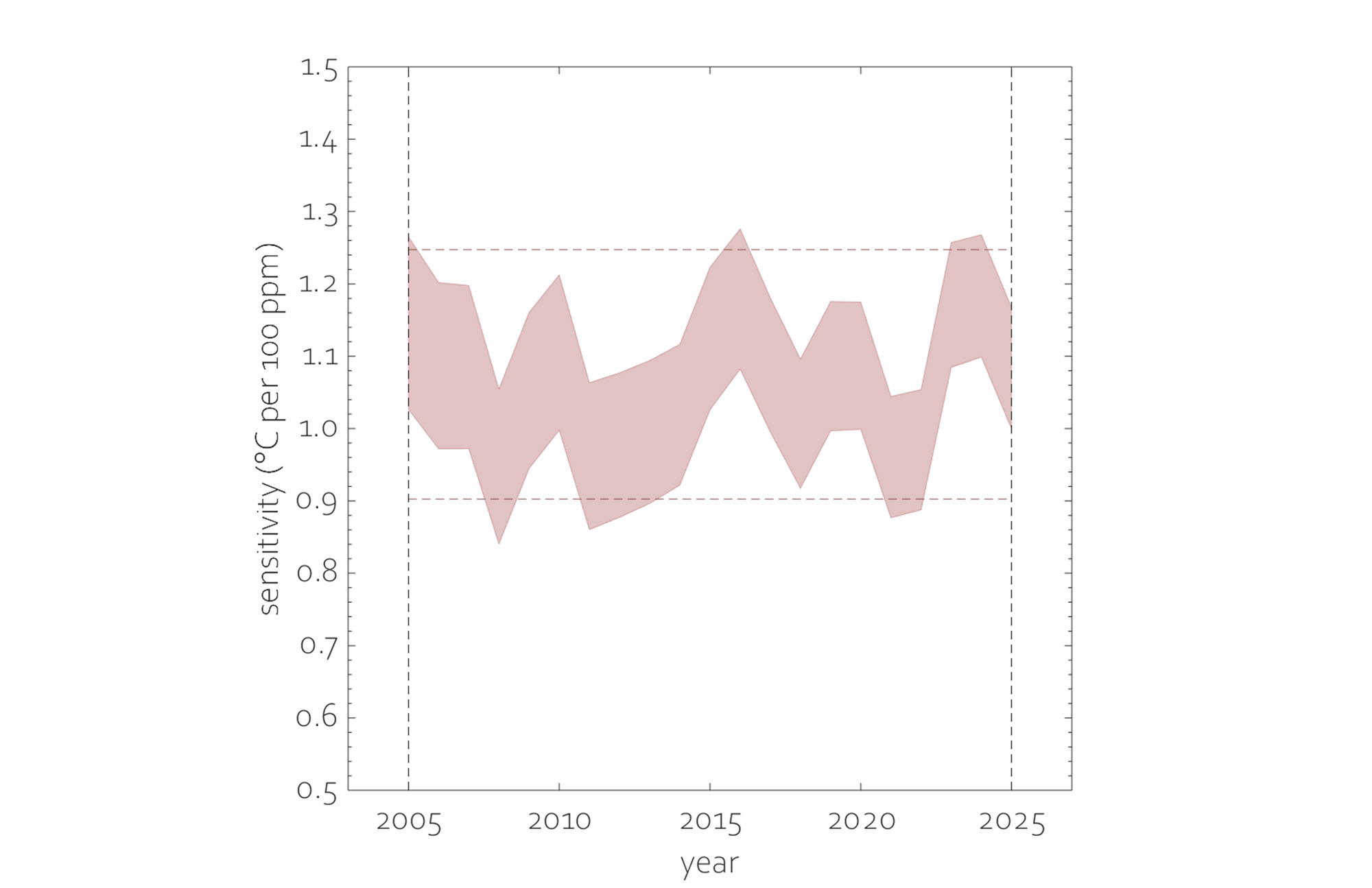 Fig. 3. How the 'observed' CO2-temperature sensitivity has changed in the last 20 years relative to its full regression estimate (dashed lines). Finally, the slope of the regression line in Fig. 1 is a measure of the climate's sensitivity to increases in atmospheric CO2. Although this appears to have been somewhat constant (hence the straight line), it is really important we test this to remain vigilent over any recent changes in the climate system that could lead runaway warming. Fig. 3 shows a simple such test where I estimate the CO2-temperature sensitivity simply as the ratio of the pre-1700 baselined annual CO2 and temperature change data. Doing this for 2005 to 2025 suggests we are still in a linear regime, for now at least, and the radical warming we saw in response to the 2023/24 El Nino has reverted to trend in 2025 now that event has passed.