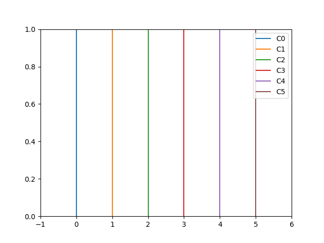 plt.axvline(i, color=c, label=c) # create vertical lines to show off colours