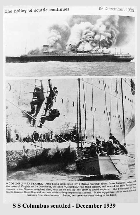 The chain of events began when S.S. Columbus, the third largest and one of the most luxurious vessels in the German merchant fleet, left Vera Cruz (Mexico) for Germany on the 14th December 1939. She was shadowed by U.S. warships of the Neutrality Patrol, which transmitted her position in plain language. These signals led the British destroyer Hyperion to Columbus on the 19th December, some three hundred miles off the coast of Virginia; but the German crew lost no time in destroying the vessel by fire. The Germans were soon picked up from their life boats and landed back in the United States where British intelligence tracked their movements.