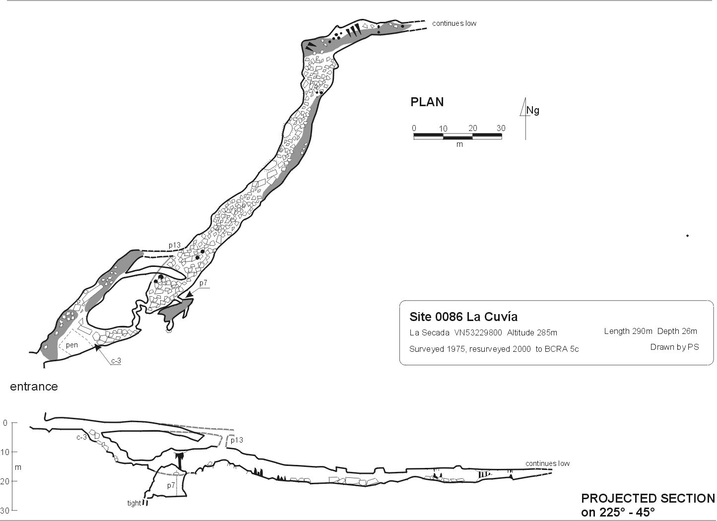 Much poking about in the floor and roof near the end has extended La Cuvia by little. At the end there seems to be a passage which is well choked with cobbles and sand but is not a diggable prospect. The cave may have drained the Matienzo depression in the past. It lies close to Tres Niños and well above the end of Argument Passage in Cueva Carcavueso.