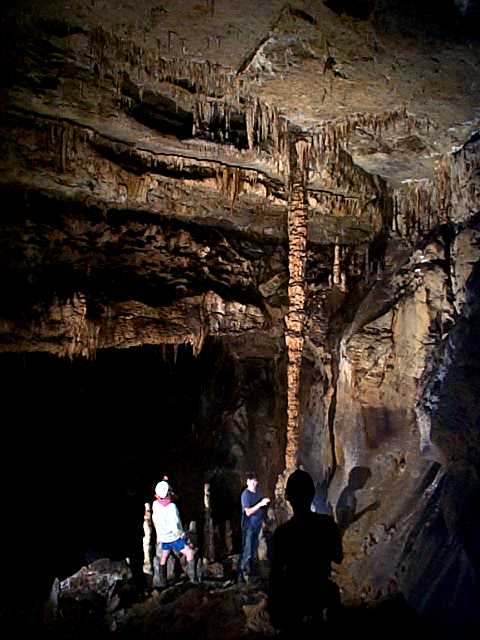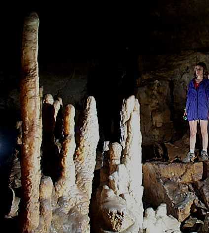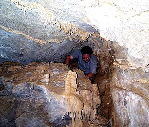 Steps lead down into the large cave vestibule that contains two water troughs in its entrance. The entrance chamber has probably been in use since prehistoric times. A climb down on the right of the chamber (where prehistoric pottery has been found) leads to a small, meandering passage that breaks out into a large chamber and a superb 7m high column. Just before this, on the right of the main passage, is a crawl through to the head of a 7m pitch down into a sandy-floored chamber, with a small passage and separate "chamber" at the far side. The main cave passes through breakdown chambers with formations and then becomes small to the right, ending at a choke of boulders.