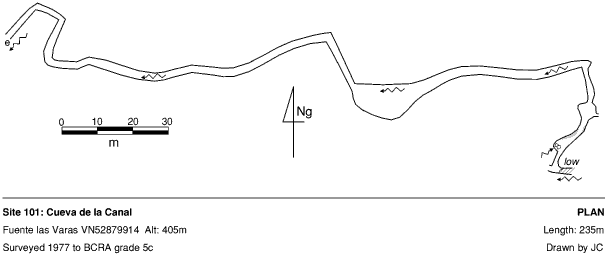 The entrance is a resurgence at the head of the wooded valley behind Fuente las Varas Bar. The whole of the cave is stooping or walking in water and the "end" is where the going becomes flat-out. This point could be near the bottom of Cueva de Fuente las Varas (104).