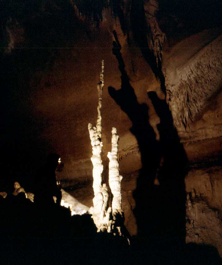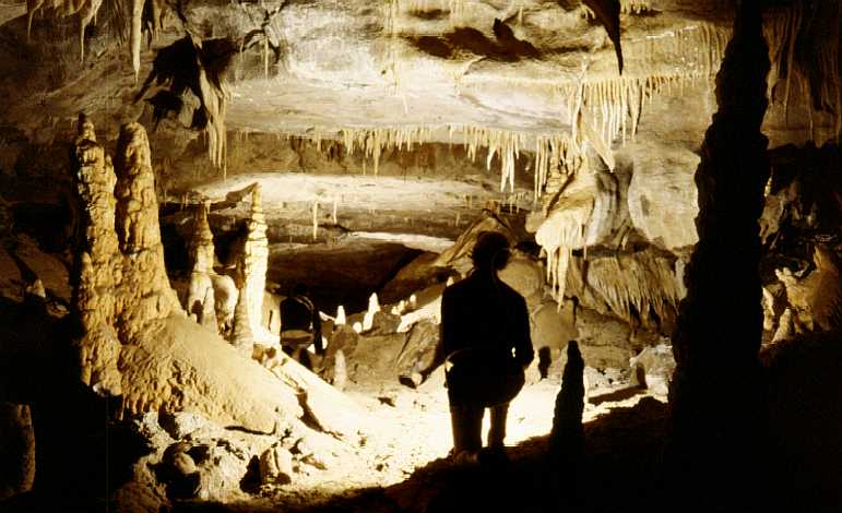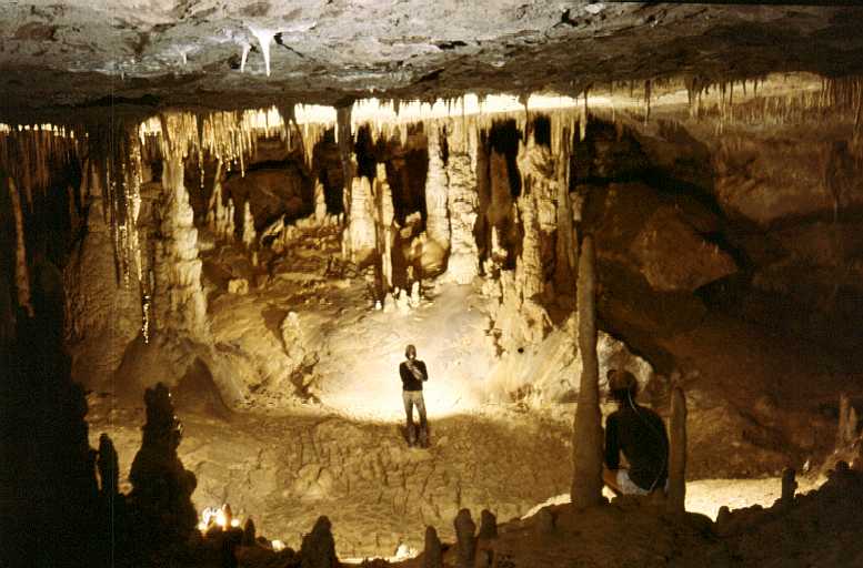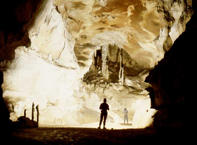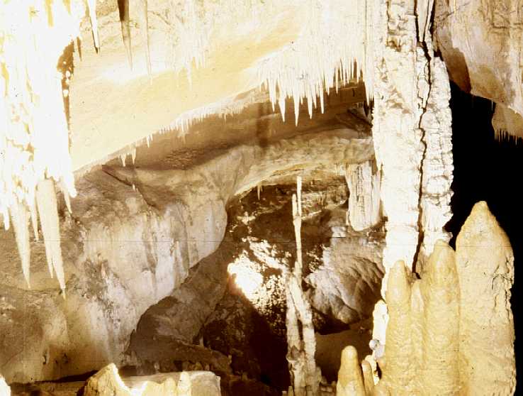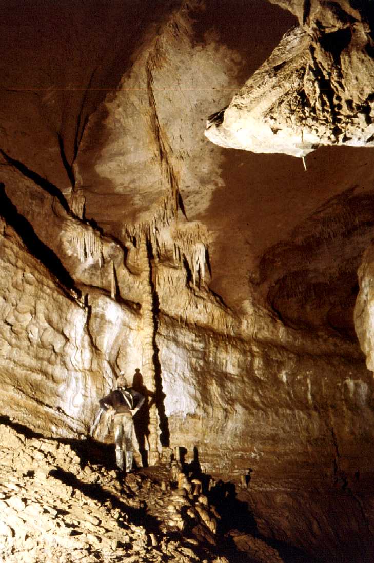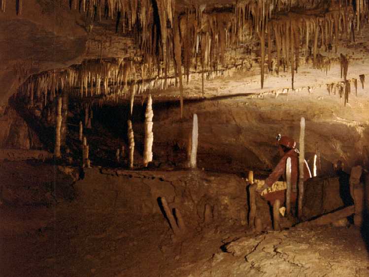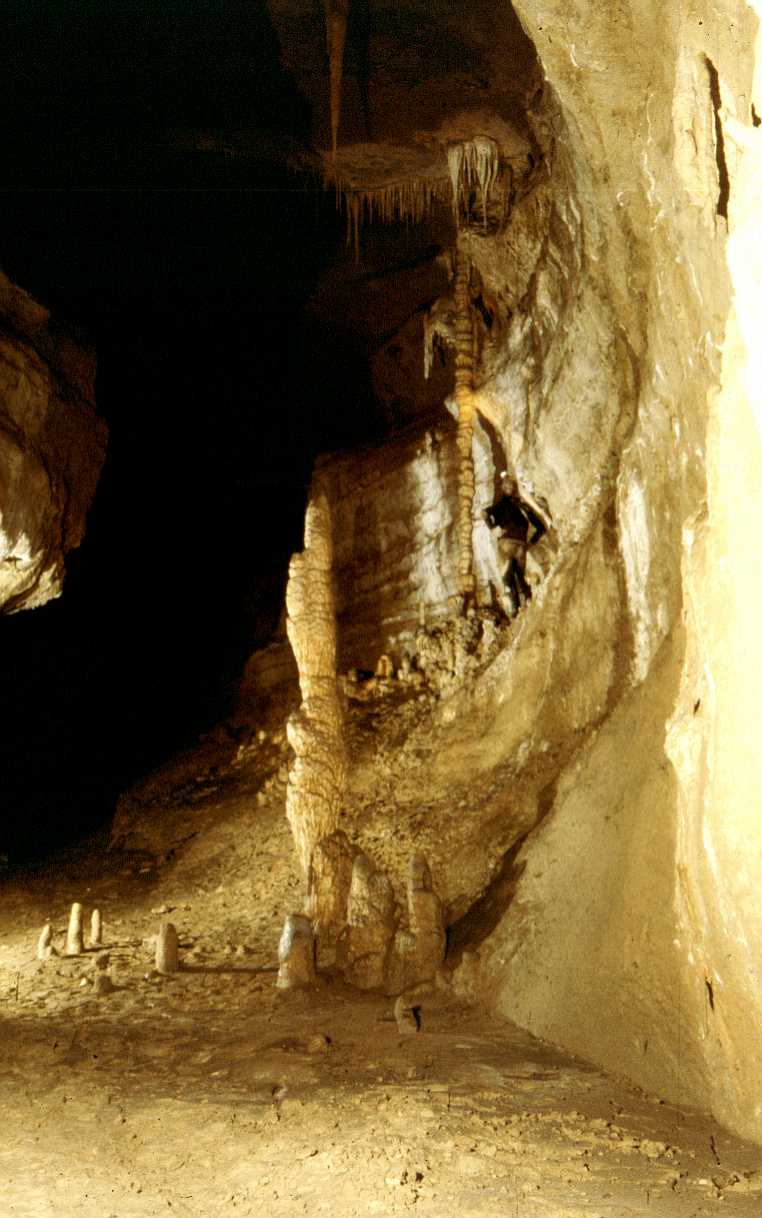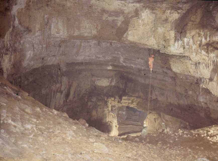 At the head of the boulder slope in the entrance chamber there are three greasy calcite climbs. The right hand climb leads into Misty Passage - 200m of well decorated passage containing an 18m pitch followed by a 17m pitch into the chamber at the base of the Greasy Slope. The middle climb leads to a veranda that overlooks the same chamber, while the left hand climb leads into a completely different series.