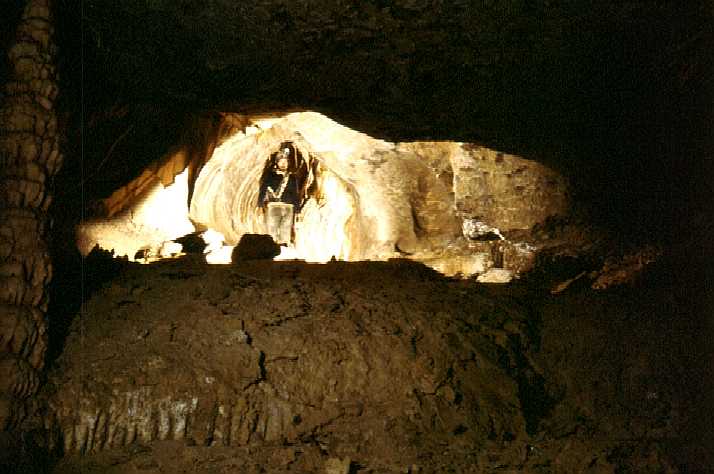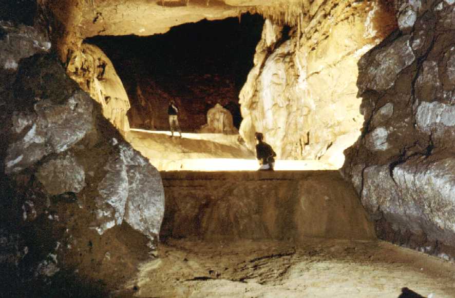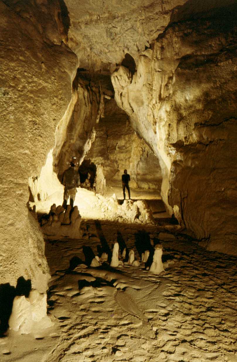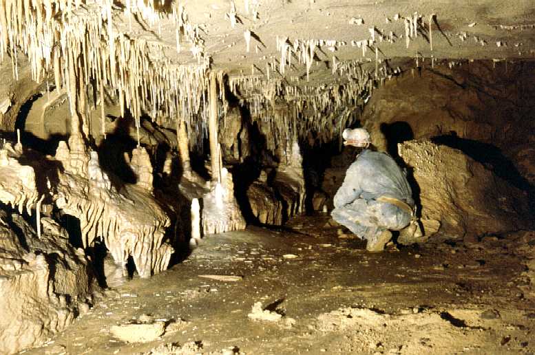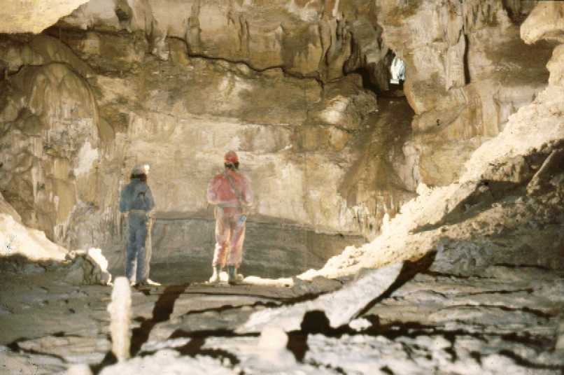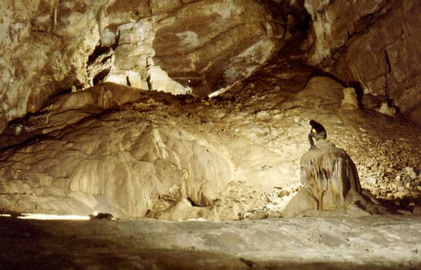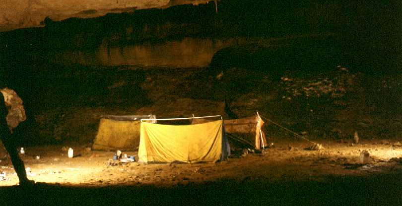 Back at the Campsite, a short passage to the right leads to two huge avens while straight ahead is a a hading rift which ends at an aven. To the left is a large passage that divides after 100m with both branches soon choking.