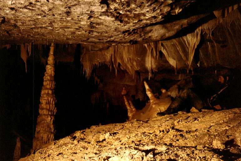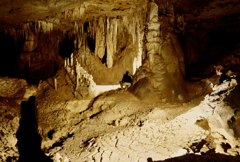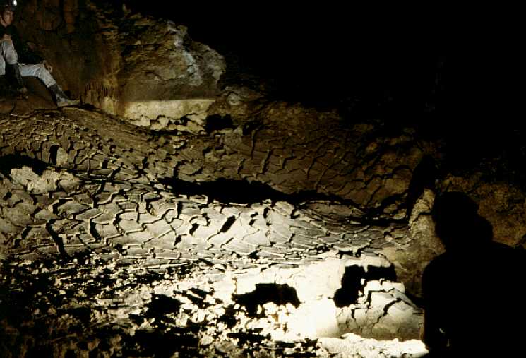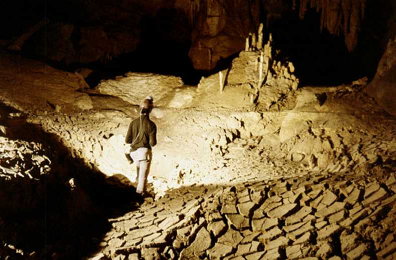 On the right of Quick Trip Passage it is possible to climb up to a parallel high level passage that contains some fine formations and cracked mud floors.
