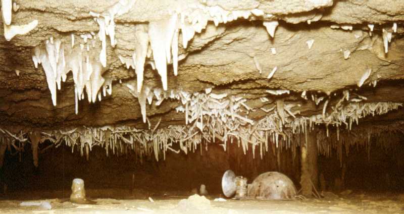 Upstream the passage is too low but contains white cave axellids?? - Terry?. A climb leads to a calcited traverse back to the streamway. An interesting WC constriction leads to more streamway and a difficult 5m climb up a waterfall to a passage which is mainly crawling. A calcited squeeze is the only obstacle to reach a large aven, massively encrusted with moonmilk after about 300m. The streamway continues low beyond.