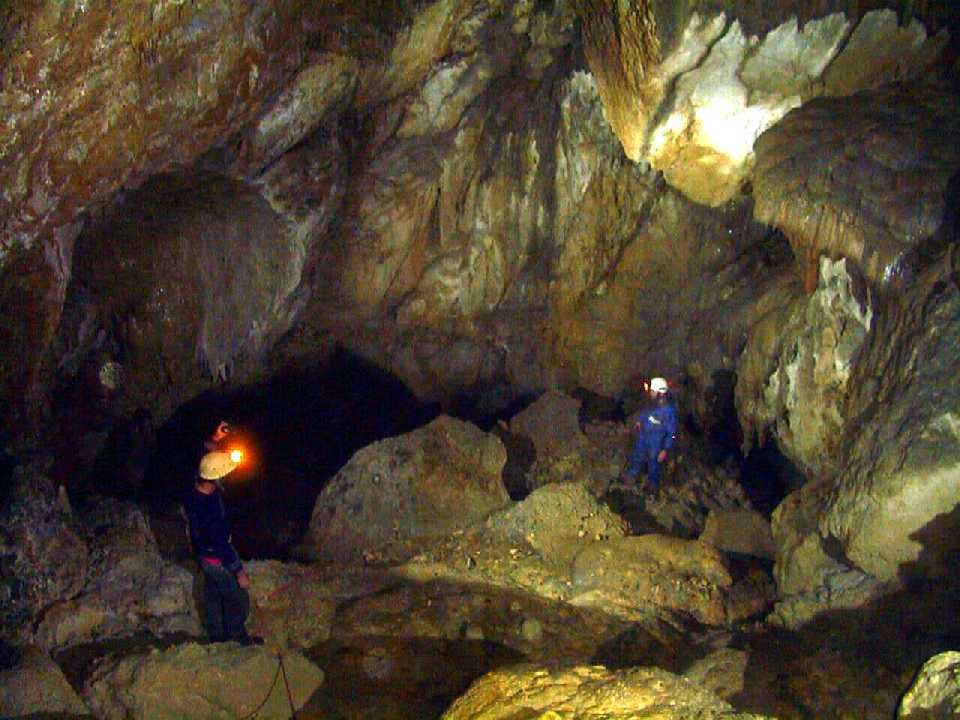 A bedding plane slot leads to a large sloping chamber that veers down to