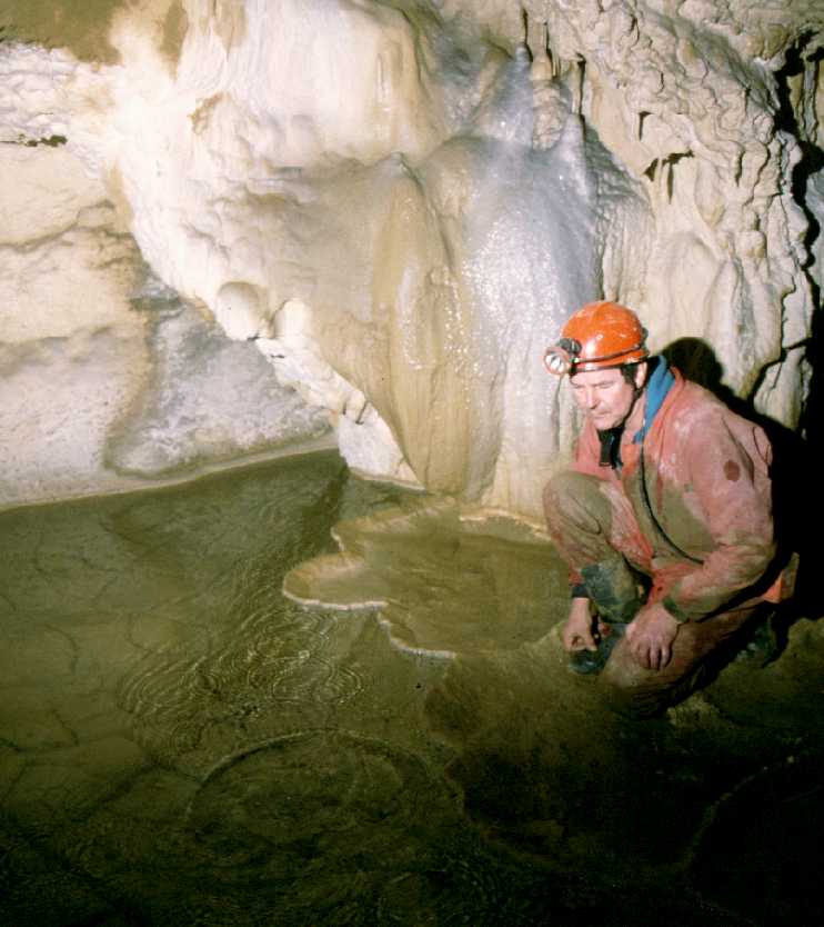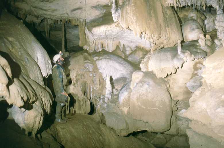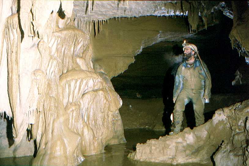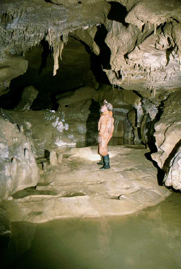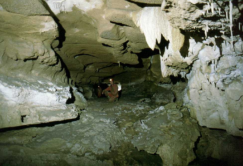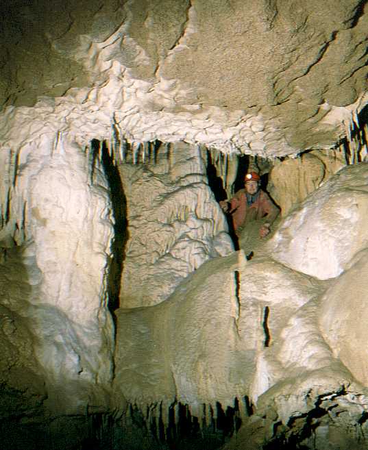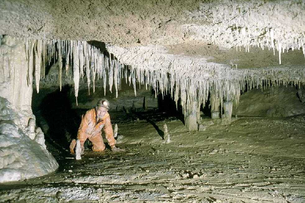 Two routes are possible out of the main chamber. The right hand passage is walking and then a low crawl into a chamber; the left hand passage is lower, wider and contains some fine gour pools. This passage emerges in the roof of the chamber and it is possible to climb down. A couple of routes from here eventually combine in a cracked mud floor chamber which leads to 250m of walking and stooping in a well decorated passage. This ends at a low, wide bedding which, at Easter 2000, was poked out to the surface near a field of ostriches. A large flake prevents an exit.