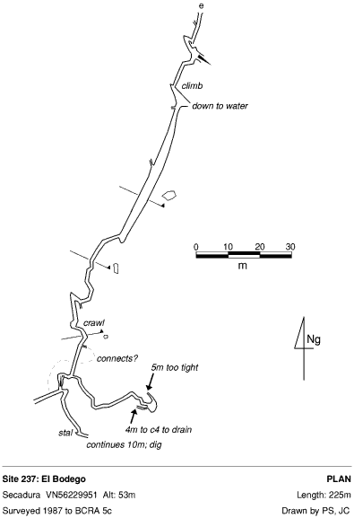 In 1998, 51m were surveyed near the end, linking 2 passages, and the Aruco Series was entered. This starts halfway down the cave and passes beneath the entrance to end in a boulder choke near the path.