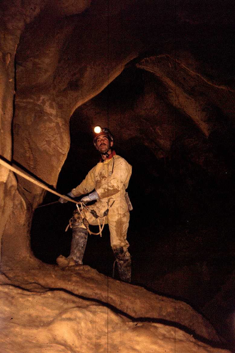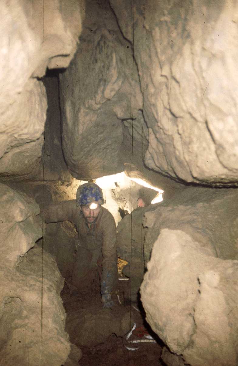 In 1998, extensions off Patrick's Silly Passage - the Peardrop Series - were explored. A squeeze leads to a roped traverse and a climb up of 4m in a draughting passage to a 6m pitch and a 5m pitch (which can be bypassed) into a 6m wide chamber which chokes in both directions. In 1999 1st Return was extended past an exposed bold step into the continuation of the passage over an area of high vertical rifts. About 60m of rift/tube to a tall rift with an aven at one end. The draught is lost. In 1999 the large Fossil Chamber back on the main route was surveyed and was found to contain a couple of 100m+ avens. In Two Owls Passage, before the traverse, a couple of pitches were dropped; one, a very muddy 11m blind shaft; two, rigged off the traverse line on the main route, is a climb down to a 10m pitch which chokes to the left and to the right goes 5m to a window to a further 5m drop, undescended.
