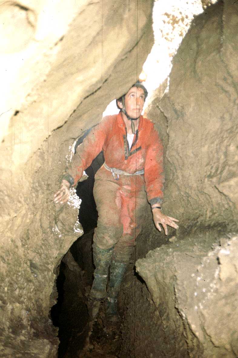 At the bottom of the pitch, Misty Series is to the right and the main way on to the left. Misty Series - a passage carrying small stream is followed to where several routes up lead into a large aven. A draughting crawl on the left in the base of the aven Diamond Lil, leads to a choke where no way on has been found. In 1993 Misty Series was again looked at: A passage on the left in the lower part of the Misty Series aven is a small crawl into a small chamber with a draughting hole. This leads to a small rift and a silty floor which was dug through to another 10m of passage to a drippy choke. There may be several tight ways upwards. On the right, just before the aven which is climbable and draughts down. this needs a return. A hole in the boulder floor of the Misty Series aven was investigated and no way on was found. The opposite wall to the draughting crawl was investigated via a traverse / climb: the passage descended for approximated 7m before ending. In 1995, the choke at the end of the Misty Series was described as suicidal.