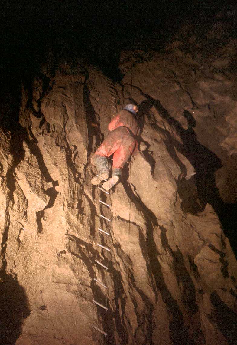 Before Baz's Choke, an opening on the left leads into Chocolate Slice - a crawl which has been excavated to allow fatties through. This enters larger passage where a slot on the left leads to a roped traverse (cow's tails). The passage beyond passes several shafts and climbs, not all pushed to conclusion. This is followed by a 12m ladder pitch down (a bolt on the right and naturals). A bolt traverse over the pitch on the left revealed nothing.