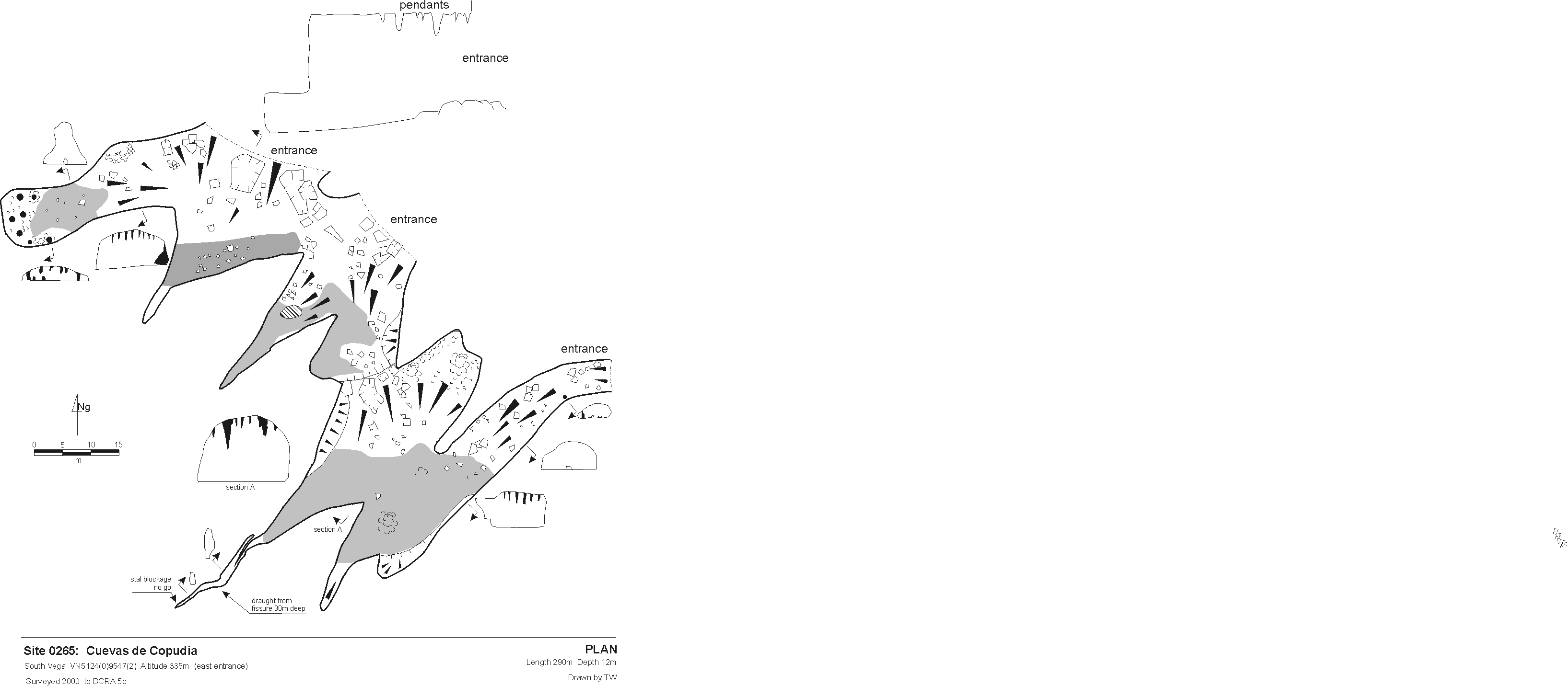 A large, impressive remnant, that was presumably connected with Torca del Coterón (264) in the distant past. The cave is formed on a set of joints. The second joint from the south has a small climb up into a rift that almost immediately drops down to an impenetrable draughting fissure (about 30m deep) and a stal blockage.