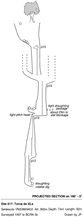 The hole in the wall with the draught whistling in was banged using Hilti caps and eventually the hole was enlarged enough to enter. A 19m pitch is followed by one of 12m. At the base, an easy, though dangerous, cobble dig has the draught going in.
