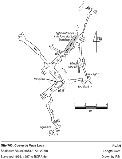 The lower hole is too small to enter and probably connects further in, while the lower one leads to a low downward slope over earth and boulders to a small chamber. Straight ahead, the cave quickly closes down in an area of tight rifts over a dug pit. Squeezing through a bedding on the right, an upward slope may be wriggled up into an excavated boulder choke. Immediately to the right a blind pit is first passed and a narrow rift ahead is entered. A pitch of 7.5m descends into a chamber with several ways out, all appear to choke with sand or mud or are too small. (This area appears to contain no draught and also seems to take much water on occasion).