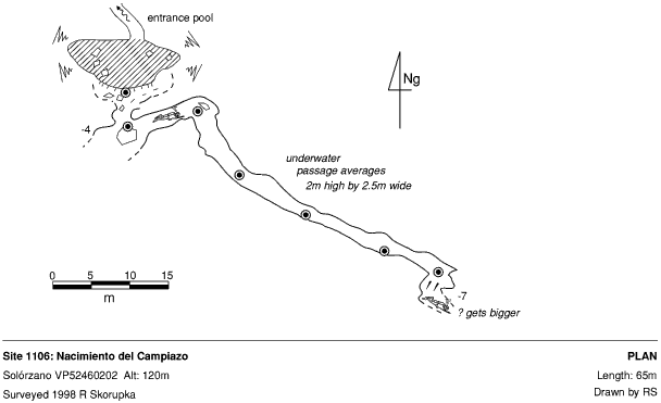 The water supply resurgence before the equestrian centre on the way to Solórzano, just before the turn off to Fresnedo. This area, to the north of Riaño, has some potential. Sandstone beds to the NW have diggable holes. The site is an arch, 3m wide by 1m high with a clear stream emerging. The entrance was full of blocks which have been shifted and there appears to be no problem with the water supply pipe. The dive descends to 4m at the entrance and then a further 3m over the next 60m. The passage is comfortable diving and appears to enlarge ahead.