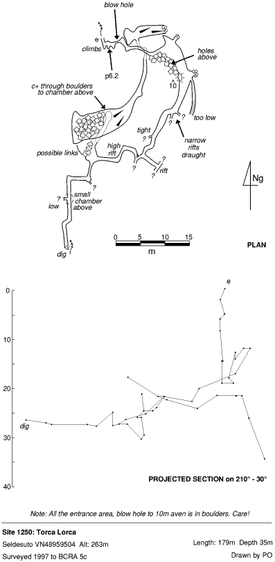 An interesting, strongly draughting hole above the stream bed. The entrance leads straight onto climbs and a 6m pitch. Excavated in a number of places the loose passage descends past various draughts and needs describing properly. The entrance series in particular has few solid walls.
