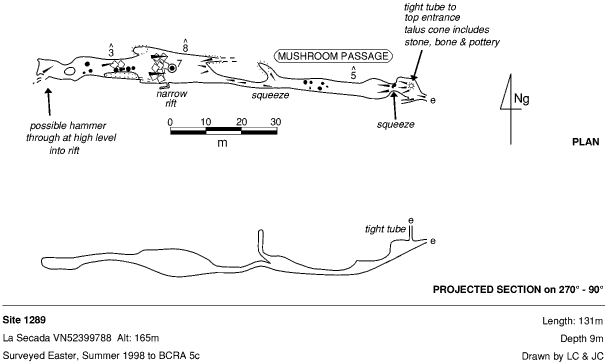 The excavated entrance slopes down to a small chamber where a talus cone (under the tight, original entrance pitch) will provide interesting material. Small pieces of pot have been found and there is the rim and side of a pot emerging from the calcited material. A squeeze down past stal leads to easy going in passage up to 8m wide and 10m high with some decorated sections (1 3 4). A second, excavated squeeze with a good draught enters further easy going past holes in the floor to where the floor meets the roof and chokes. The whole passage is quite well decorated with stal gours and some mushroom shaped stal.