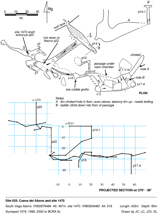 The top entrance shaft to Cueva Abono (33), discovered during the upwards aven exploration in the latter cave. A 20m pitch drops into a narrow passage that slopes down to a chamber containing the 22m pitch that links to Abono.