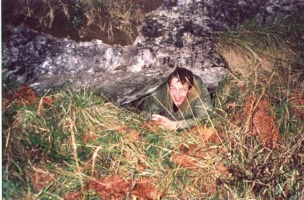 Pete Smith in the bottom entrance to Cueva de los Cefrales 0042. A picture of the top entrance is here. (photo: Juan Corrin)