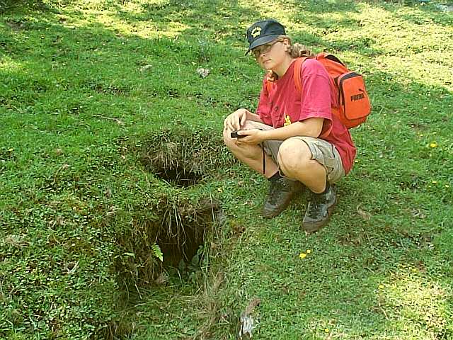 Jenny Corrin at the small, man-made (drainage?) tunnel from site 297. The main entrance is higher up. (photo: Juan Corrin)