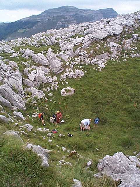 Tackling up the entrance to site 885. Muela and Mullir are the peaks in the distance. (photo: Juan Corrin)