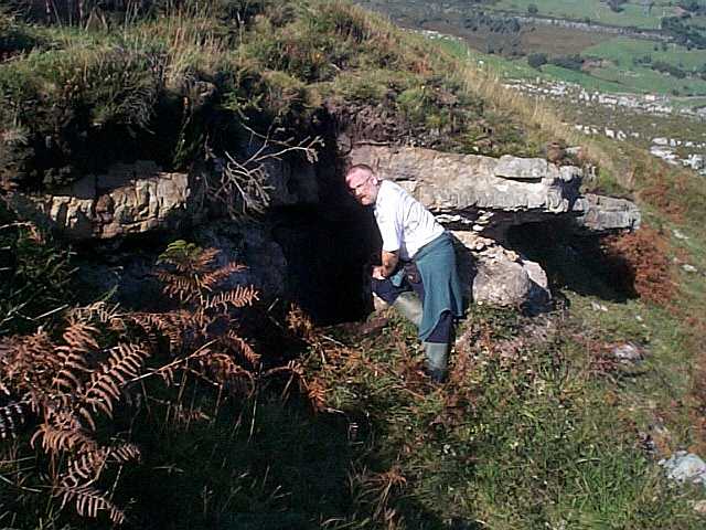 Juan Corrin at the entrance to site 967, with a weathered sandstone roof.