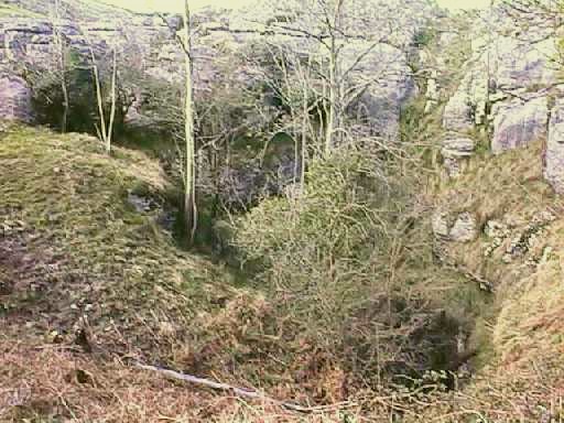The depression complex at site 1371. The water supply resurgence is on the left, the deepest point in the foreground. A distant view of the entrance is seen here. (photo: Juan Corrin)