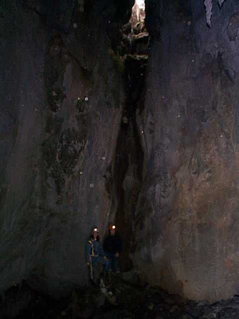 Carolina Smith de la Fuente and Jenny Corrin at the base of the shaft entrance to Cueva del Humo. (photo: Peter Smith)