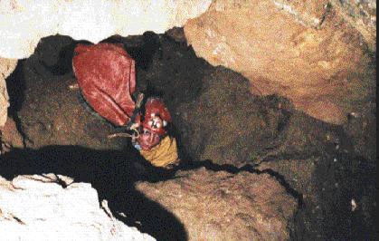 Liz Cowell passing through a squeeze in the entrance series of Morenuca.