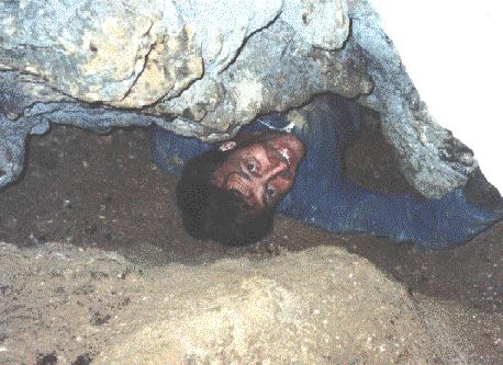 Pete Smith crawling feet-first into the excavated extension to German's Cave.
