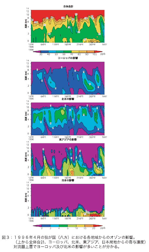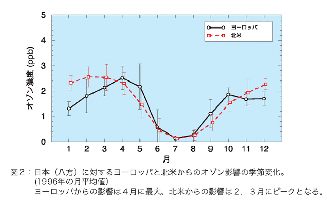 注5: その理由はヨーロッパからのオゾンが比較的地表付近で輸送されるため、地表面で壊される量が多いのに対し、北米からのオゾンは大西洋上で上空へ運ばれ、偏西風に乗って我が国まで効率よく運ばれるためである。