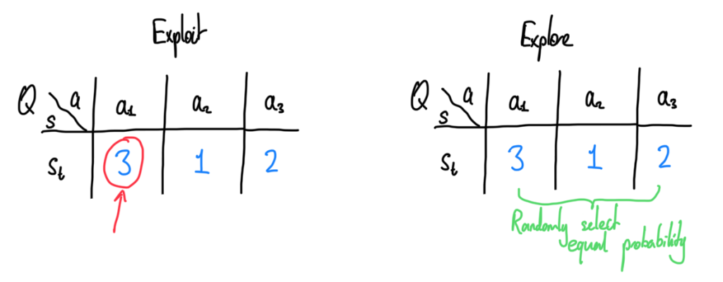 What we do in an \epsilon-greedy framework is to pick based on the Q(s,a) value for a fixed s. The idea is simple, we exploit (pick the best option) with probability \epsilon, and explore with probability 1-\epsilon.