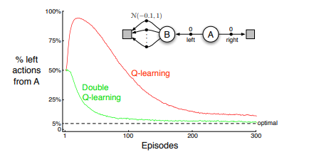 One way we can hedge against overestimation bias caused by noise is to use a method known as double Q-learning. This method is analogous to tabular Q-learning, with the extension being having two tables to store Q values instead of one.