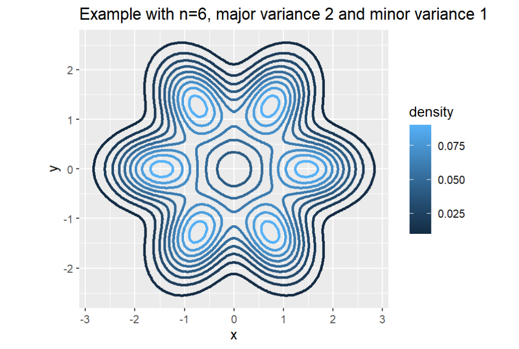 The distribution is a mixture of bivariate normal distributions, with means at the vertices of a regular polygon in the plane.