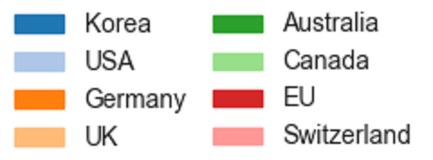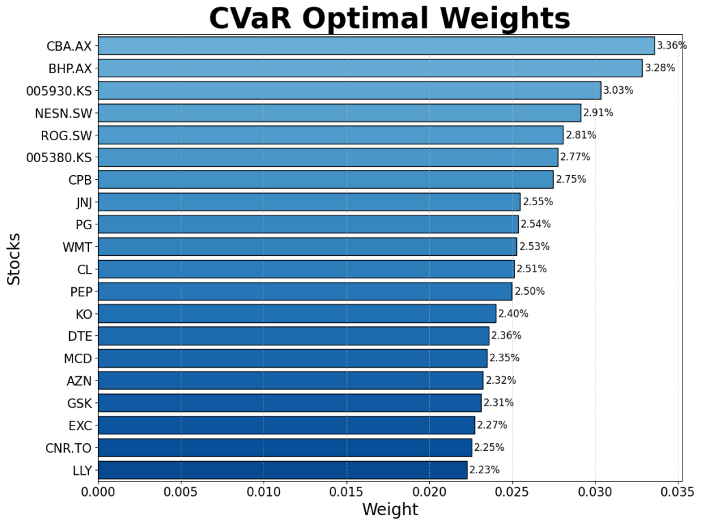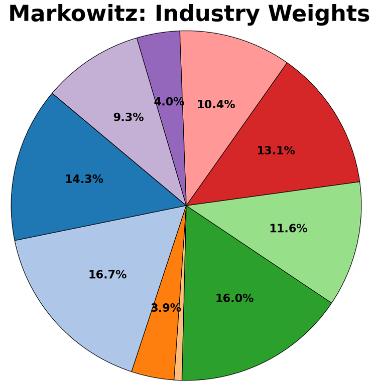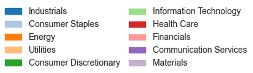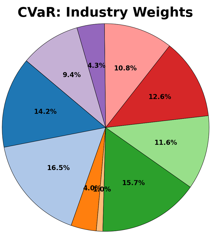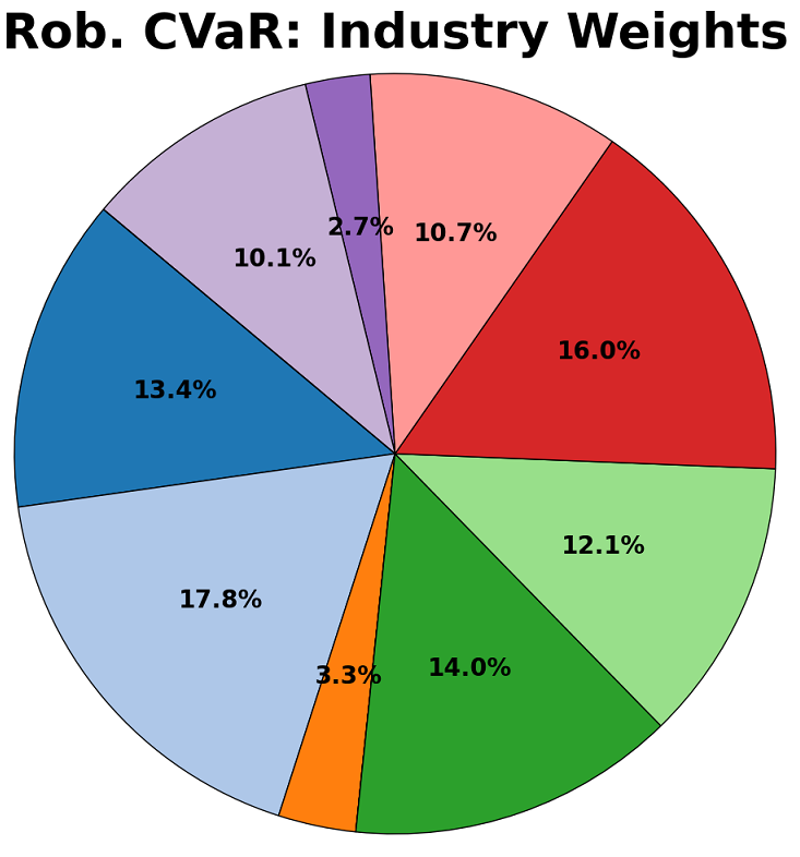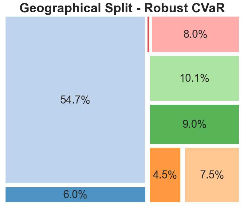 Robust and non-robust versions of the CVaR and Markowitz models were created. They were each firstly trained on historical returns data for 55 stocks from between 1995 and 2025, and their split assessed using three criterion – their stock allocation, their division between industries, and their geographical spread. These are shown in the diagrams below: