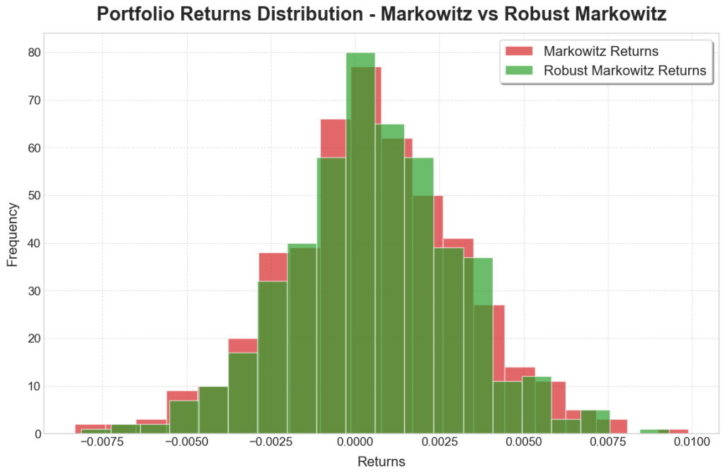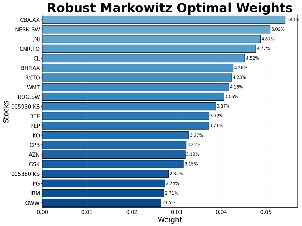 Contrary to expectation, the robust models focus a larger proportion of capital into a smaller number of “safe-haven” assets. These tend to be well-established companies in traditionally safe sectors, with a focus on steady returns rather than outsized and volatile growth. Some of the companies to consistently receive a large proportion of capital include Johnson & Johnson (JNJ), The Commonwealth Bank of Australia (CBA.AX), and Nestle (NESN.SW).