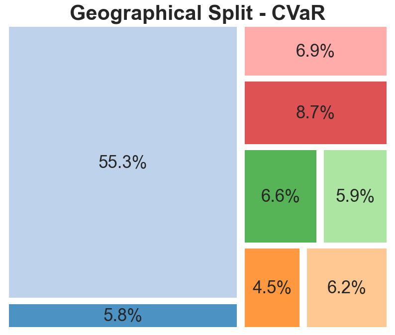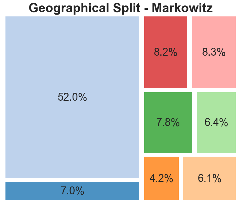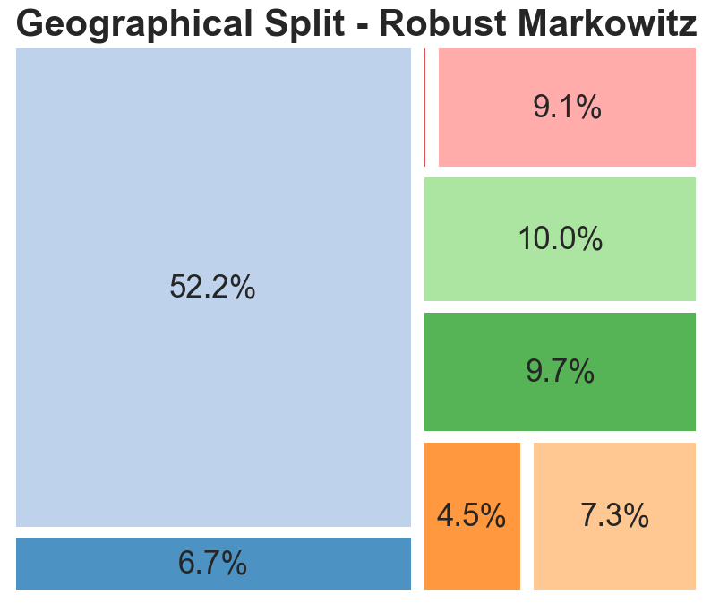 The geographical split indicates that portfolios are dominated by American listed companies, representative of the large share of the global stock market which the US represents. The main change that the robust models exhibited is a movement from EU-based companies to Australian and Canadian entities. Although this could be indicative of factors such as a lower correlation between the latter and American stocks, it is likely this is random and based more on the specific chosen companies.