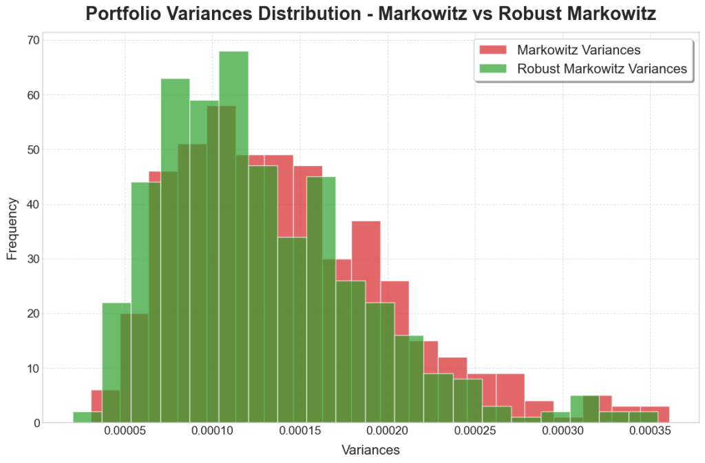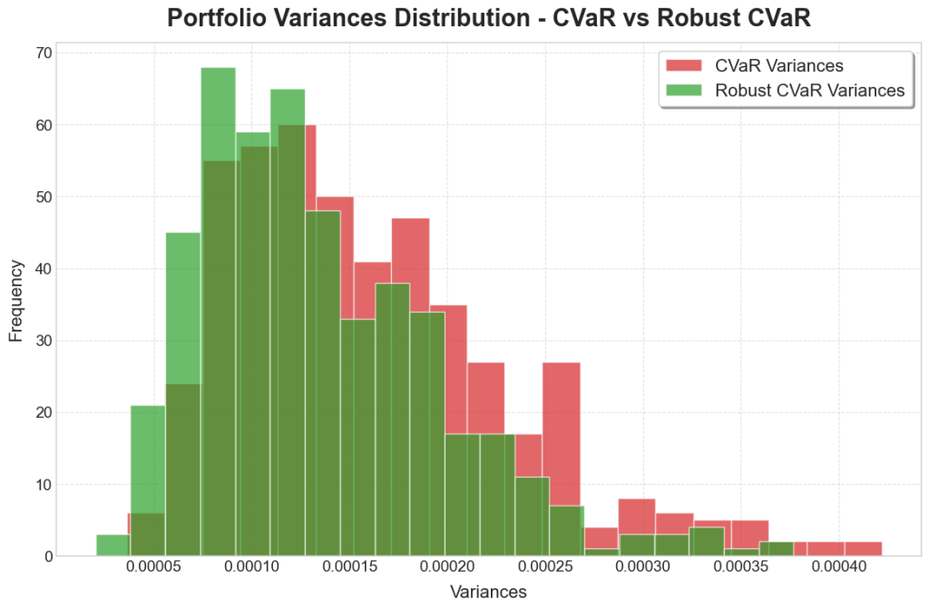 The robust models exhibited a greater concentration around the central values, resembling a t-distribution of the returns. There we also fewer values in the extremes, which is to be expected due to the extra precautions taken to ensure more security in the portfolio. Of greater interest though is the reduction in variances, with the robust models dominated by months of low variance, compared to the non-robust models having much longer tails and many months of high variance.